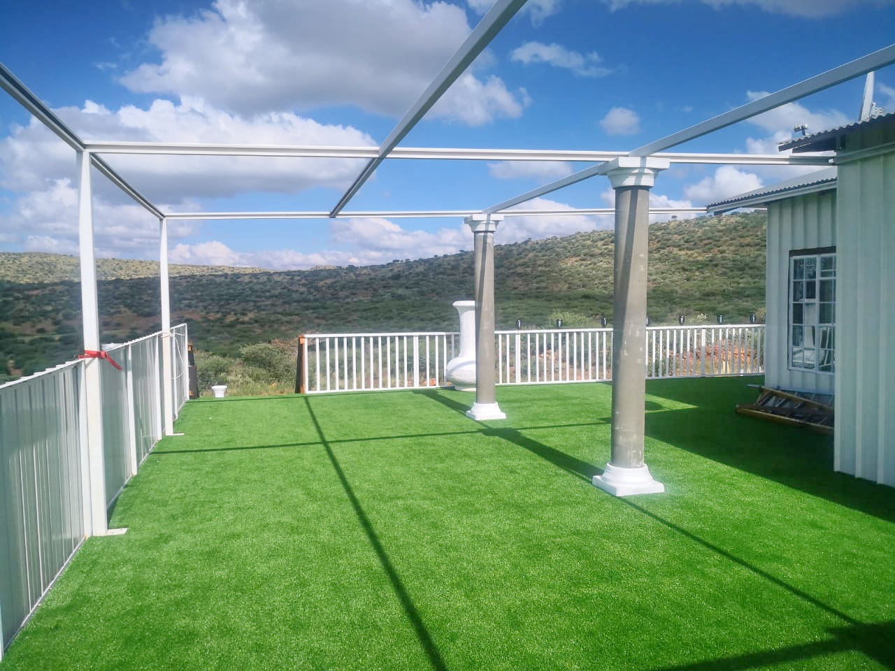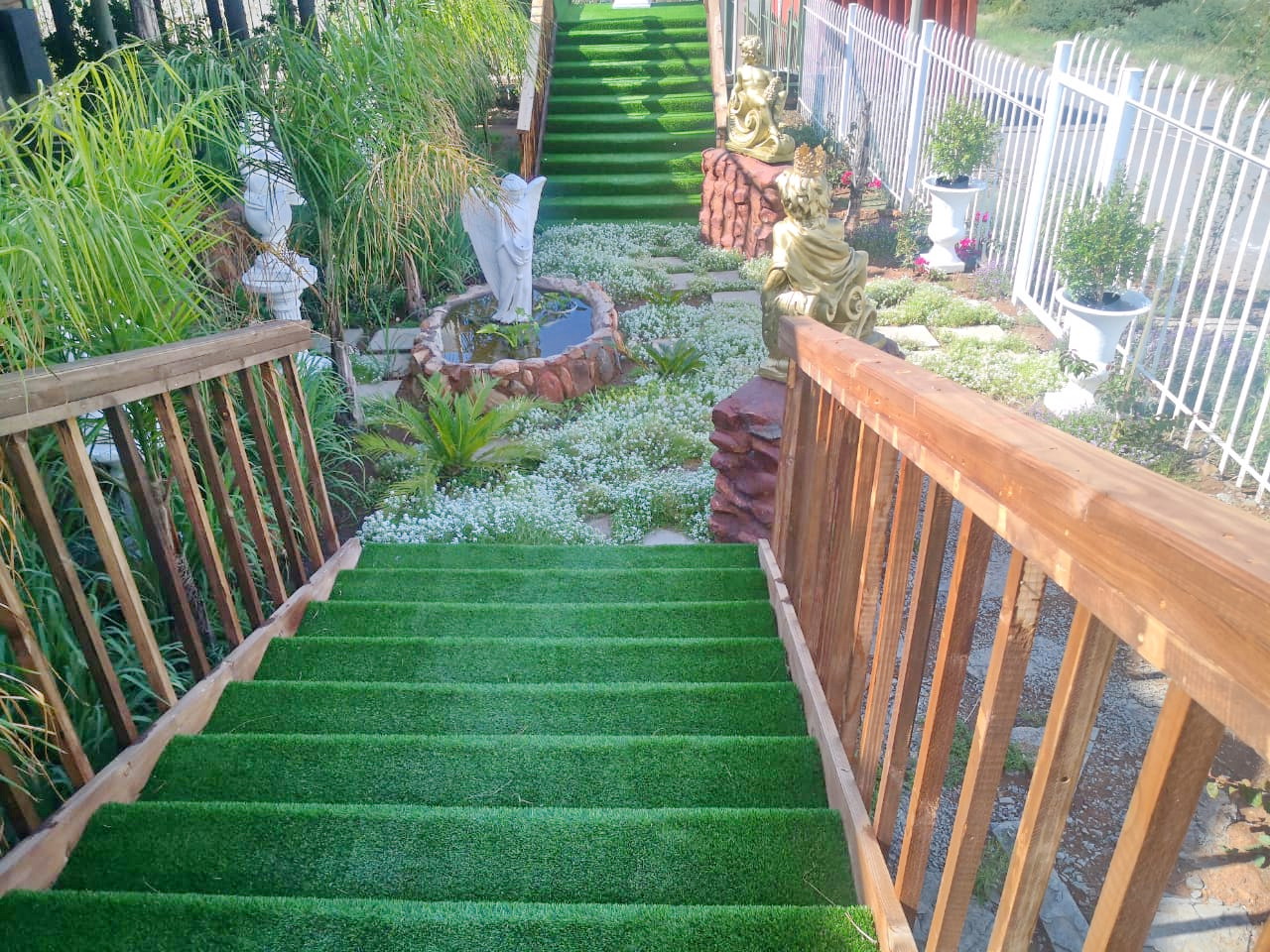 The deck and stairs are covered with artificial lawn ( guaranteed for 10 years )